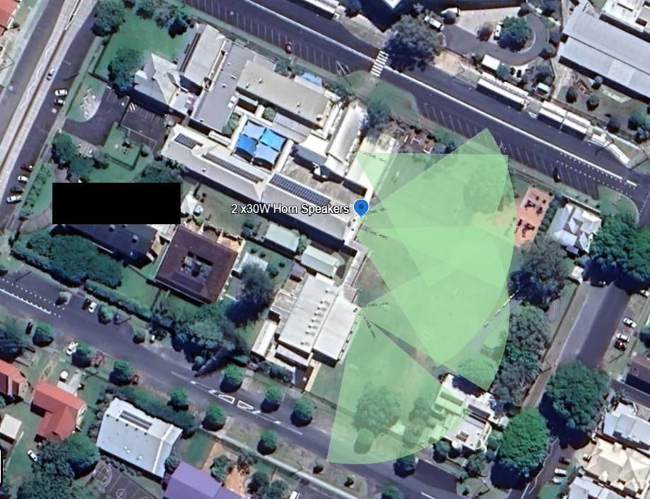 Existing 2 × 30 W Redback horns didn’t cut through playground noise at 60–70 m..