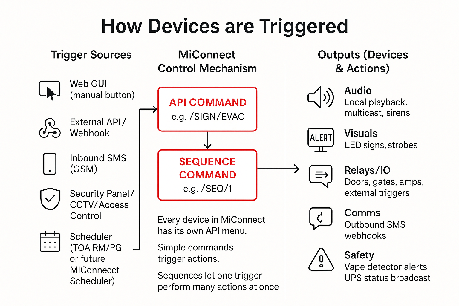 Universal integration → any third-party system (CCTV, fire, access control, BMS) can trigger MiConnect devices by sending a simple HTTP command.